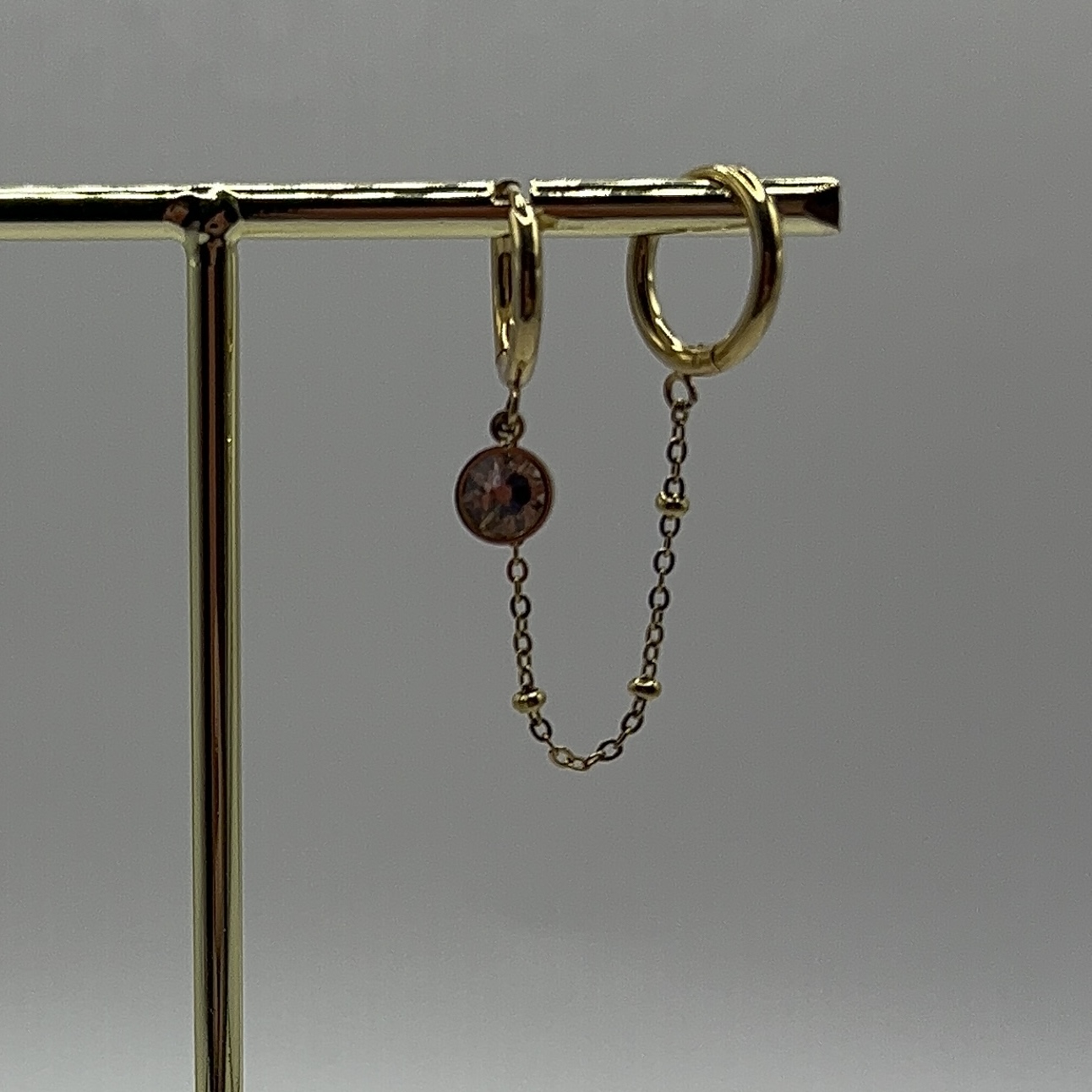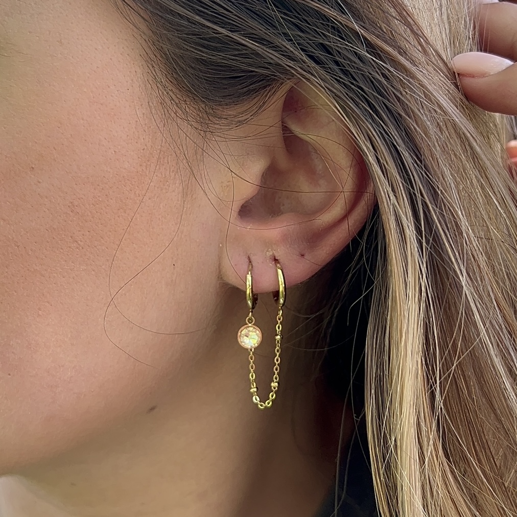 Boucles d’oreilles type mono-boucle ornées d’un cristal taillé de haute qualité et d’une chaîne.