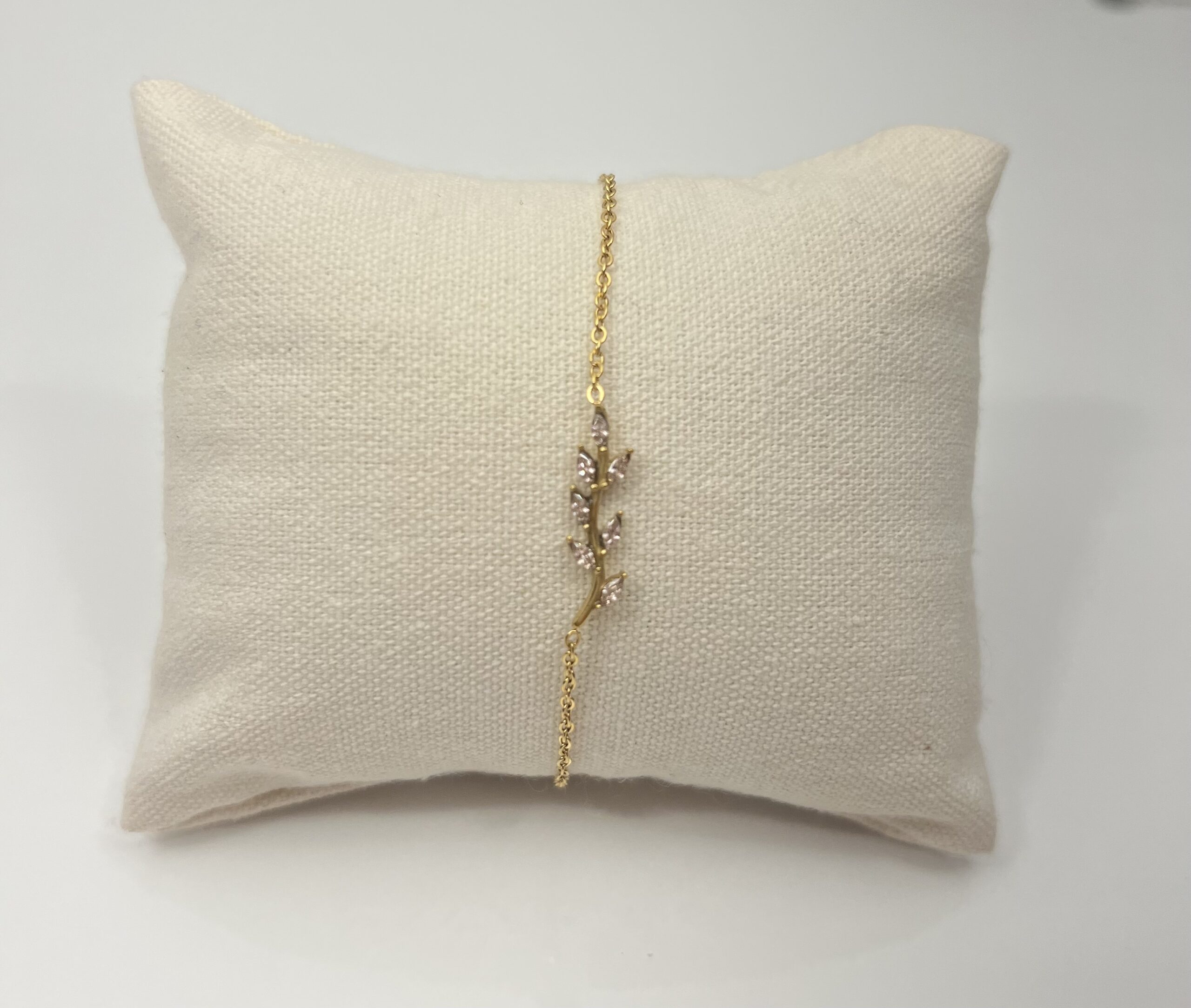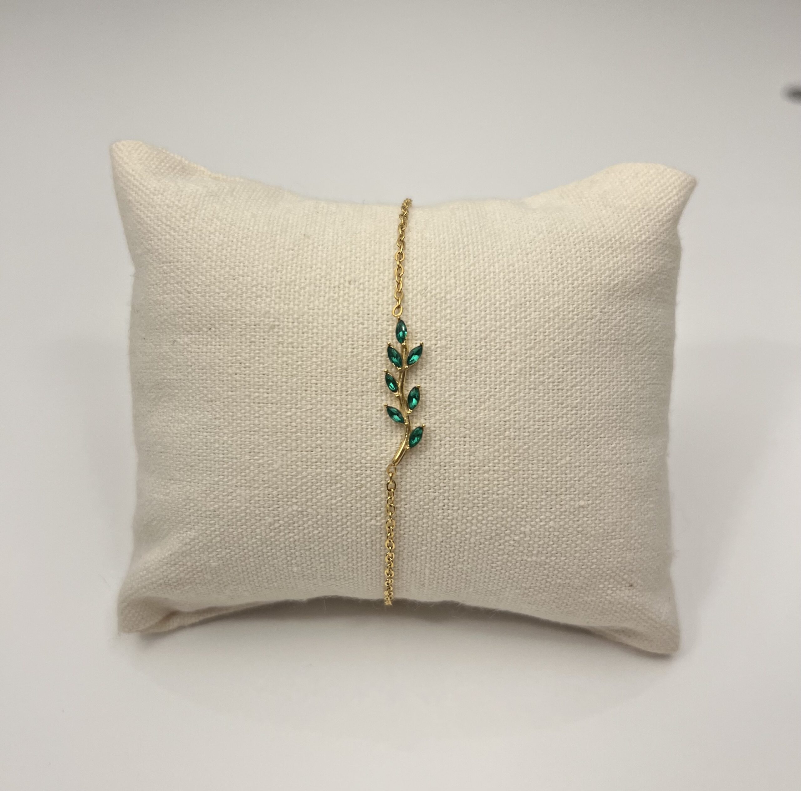 Bracelet en acier inoxydable doré, rehaussé d’une délicate feuille disponible en rose et en verte, pour une touche de nature et de féminité à votre poignet.