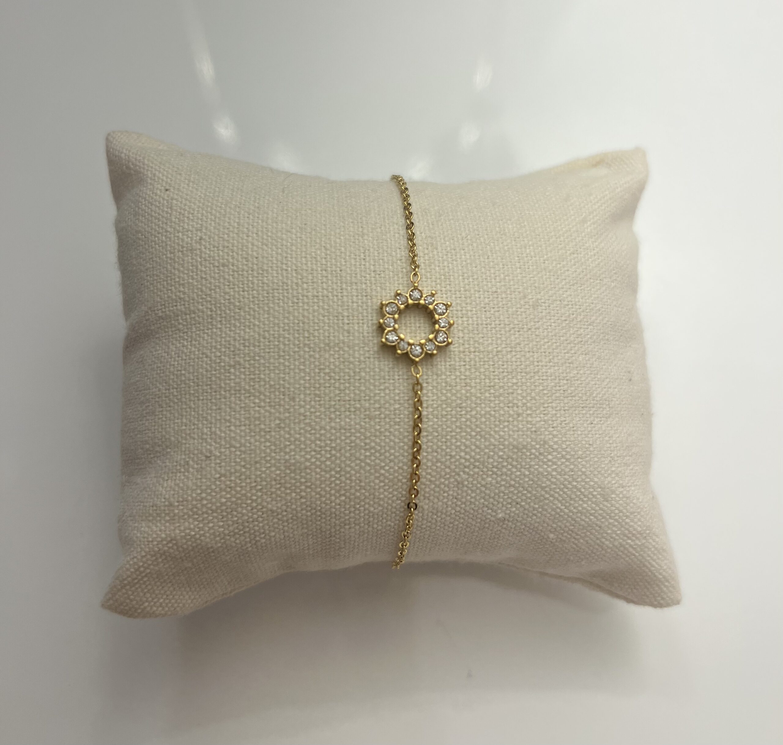 Bracelet en acier inoxydable doré orné de strass scintillants.