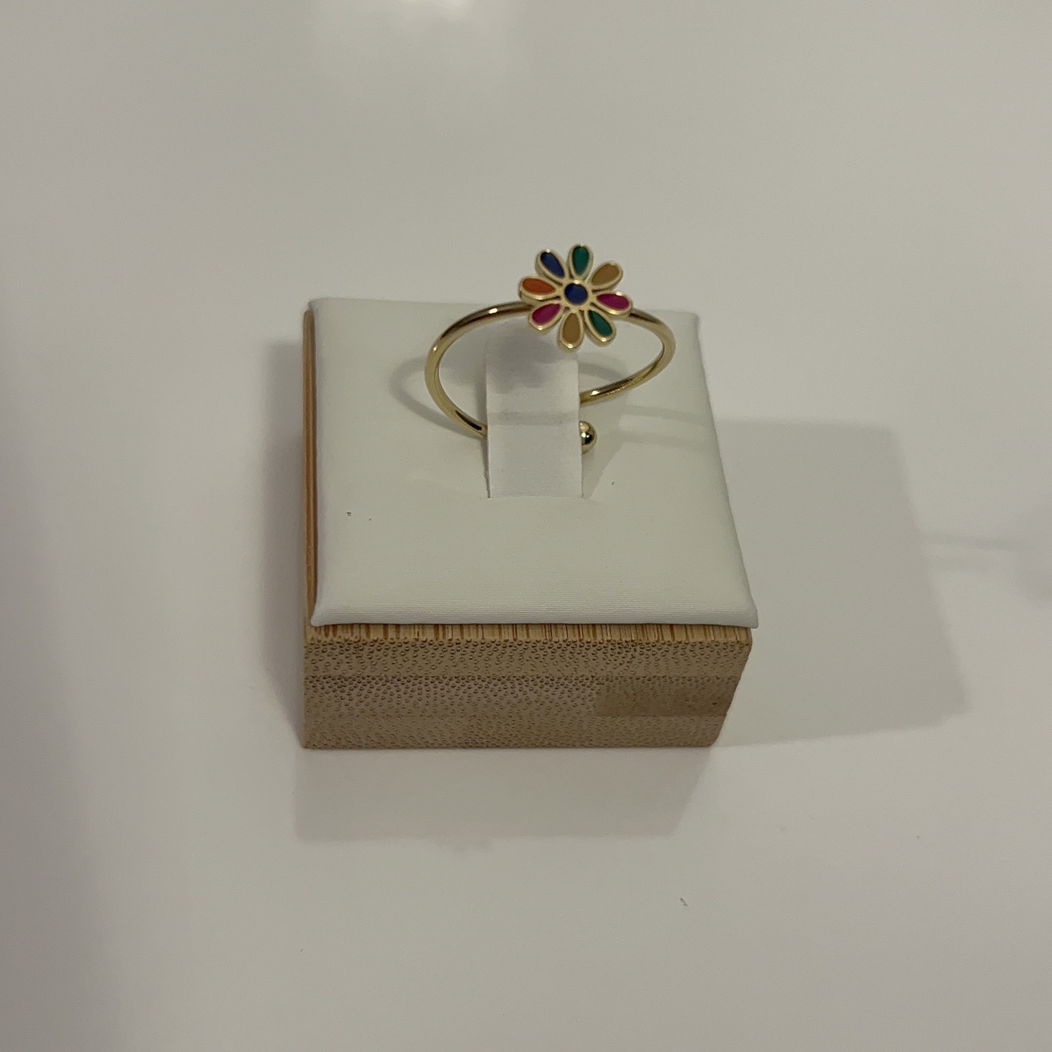 Une touche de couleur à notre bague ajustable en acier inoxydable doré, ornée d’une fleur multicolore pour un style unique.