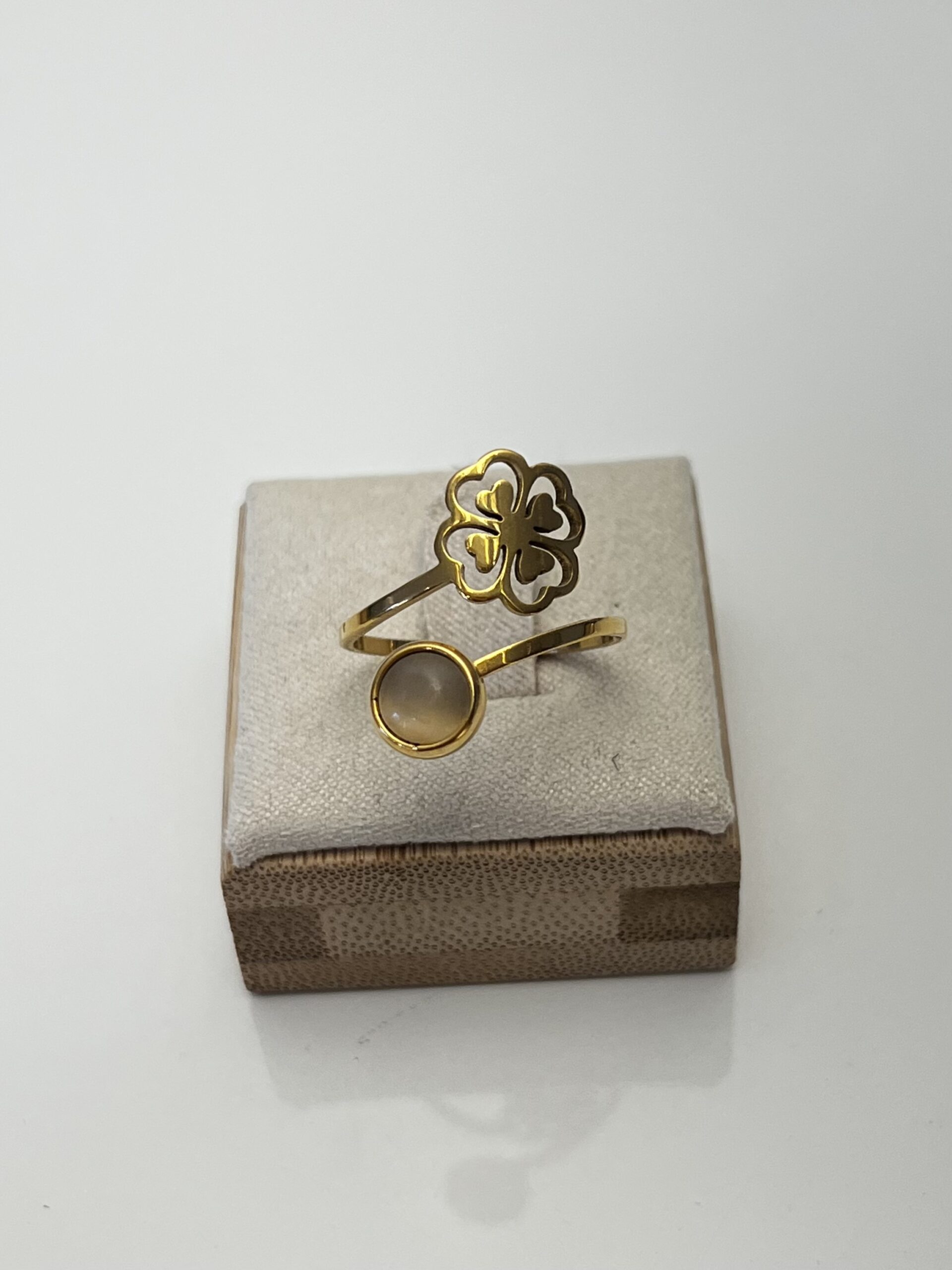 Bague en acier inoxydable doré ornée d’une délicate fleur et d’une pierre de couleur nude, pour un look tout en finesse et en douceur.