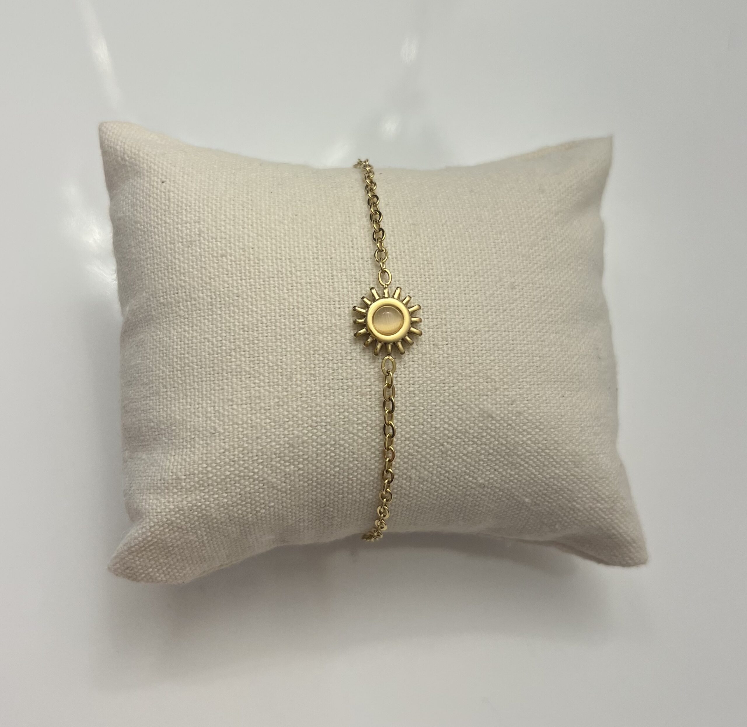 Bracelet en acier inoxydable doré avec un motif de soleil.