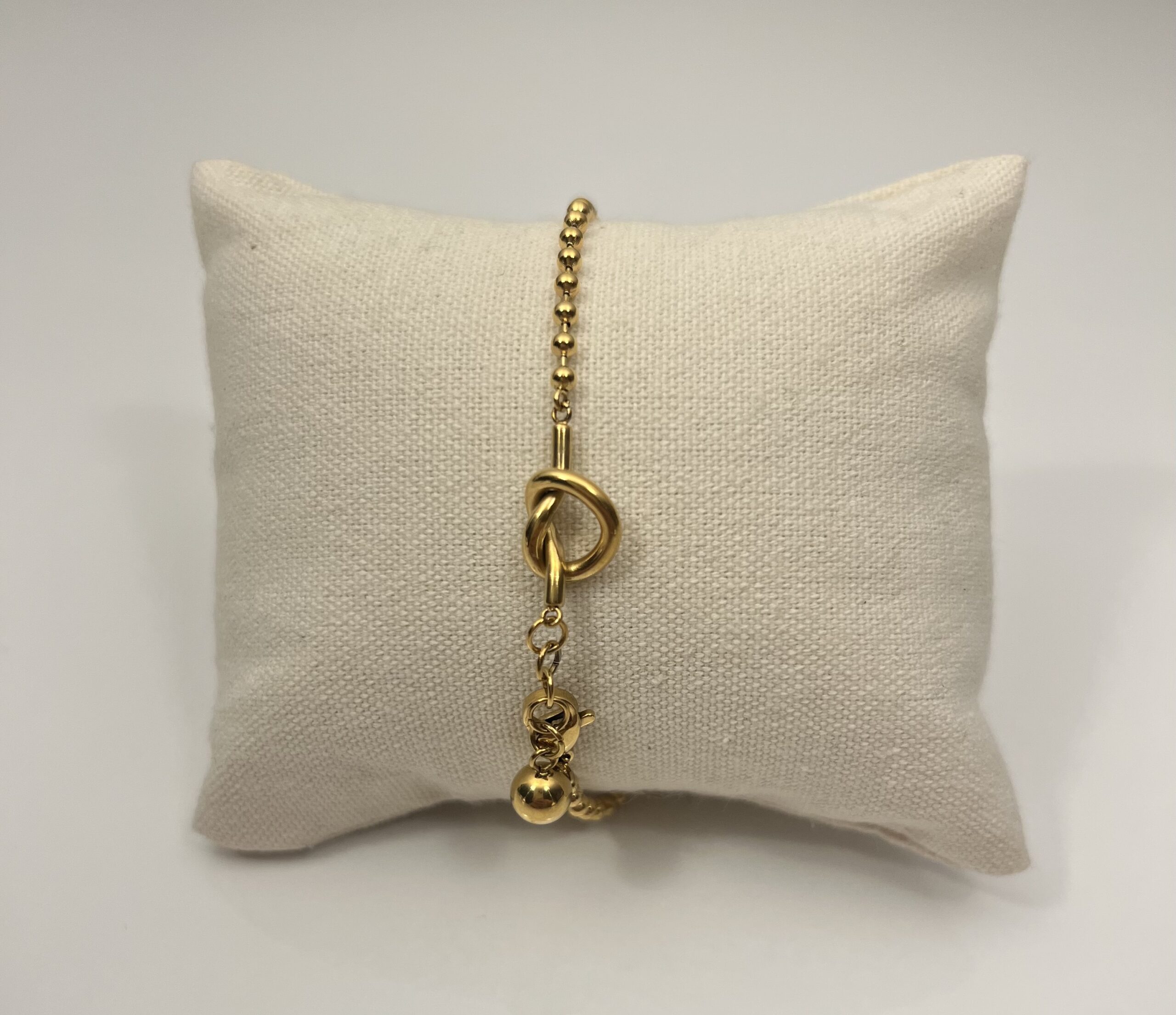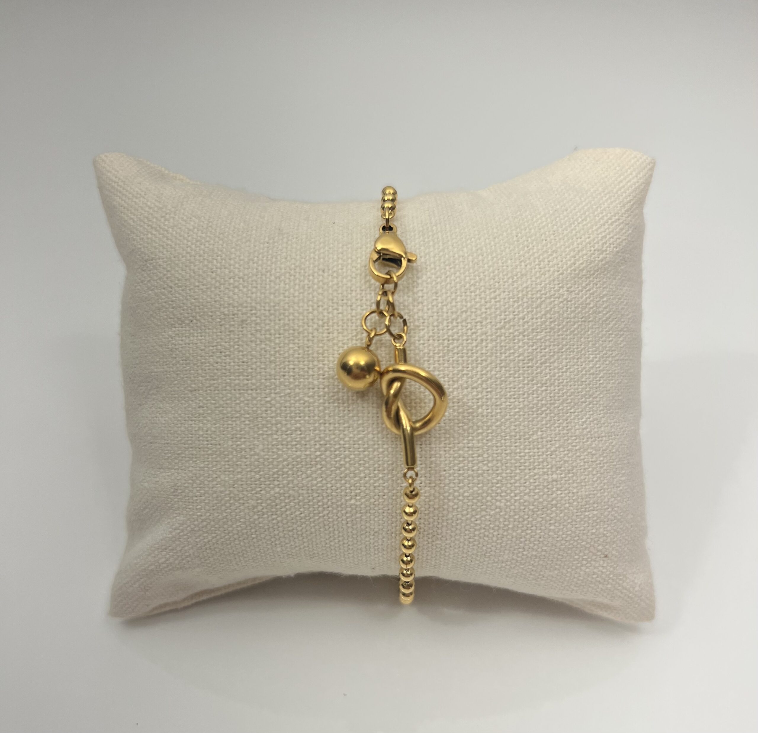 Bracelet en acier inoxydable doré, délicatement agrémenté d’un nœud à côté du fermoir, ajoutant une touche d’élégance et de charme à votre poignet.