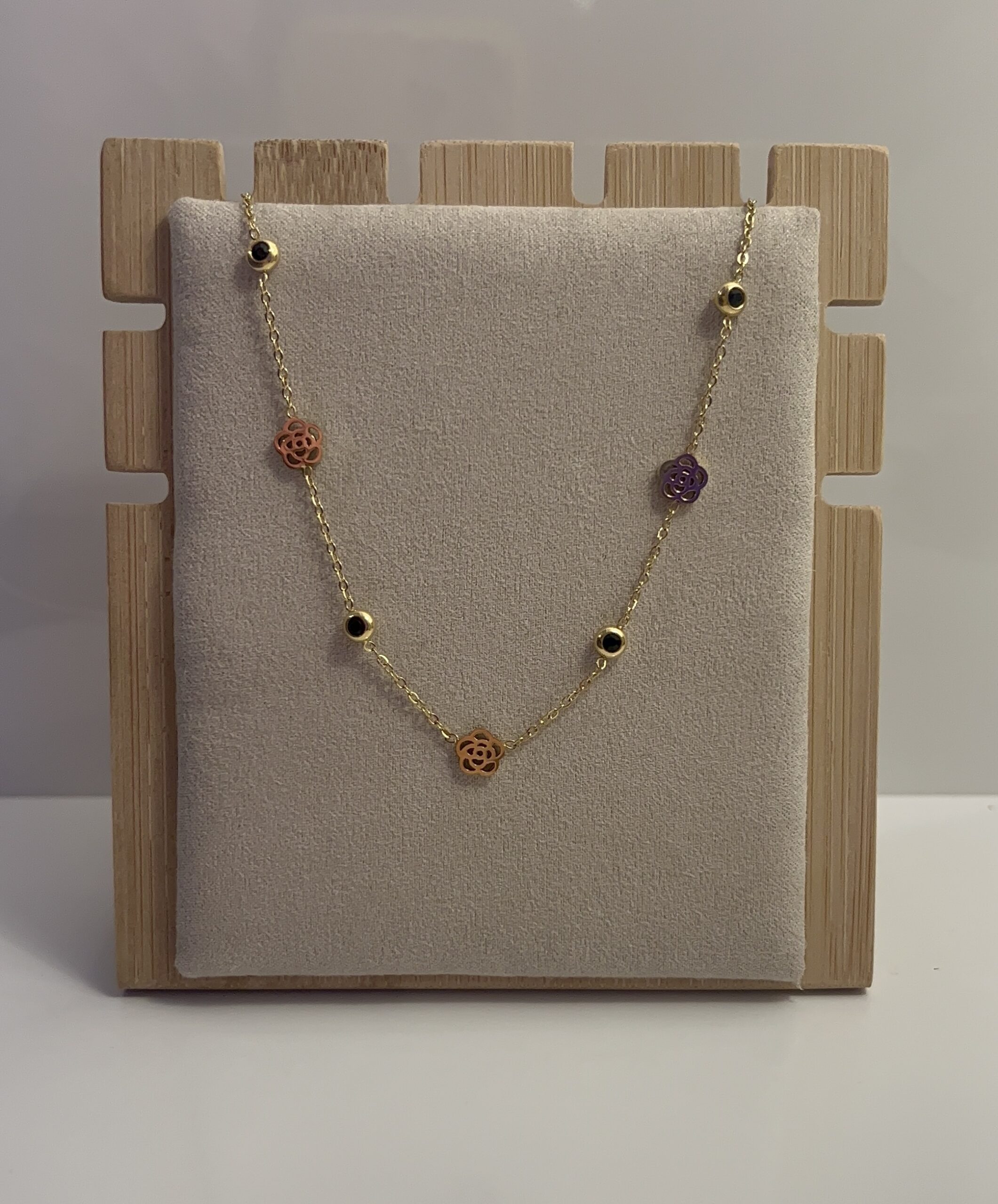 Ce collier en acier inoxydable doré est une subtile déclaration d’élégance, orné de délicates fleurs qui évoquent la beauté intemporelle de la nature avec une touche moderne et raffinée.